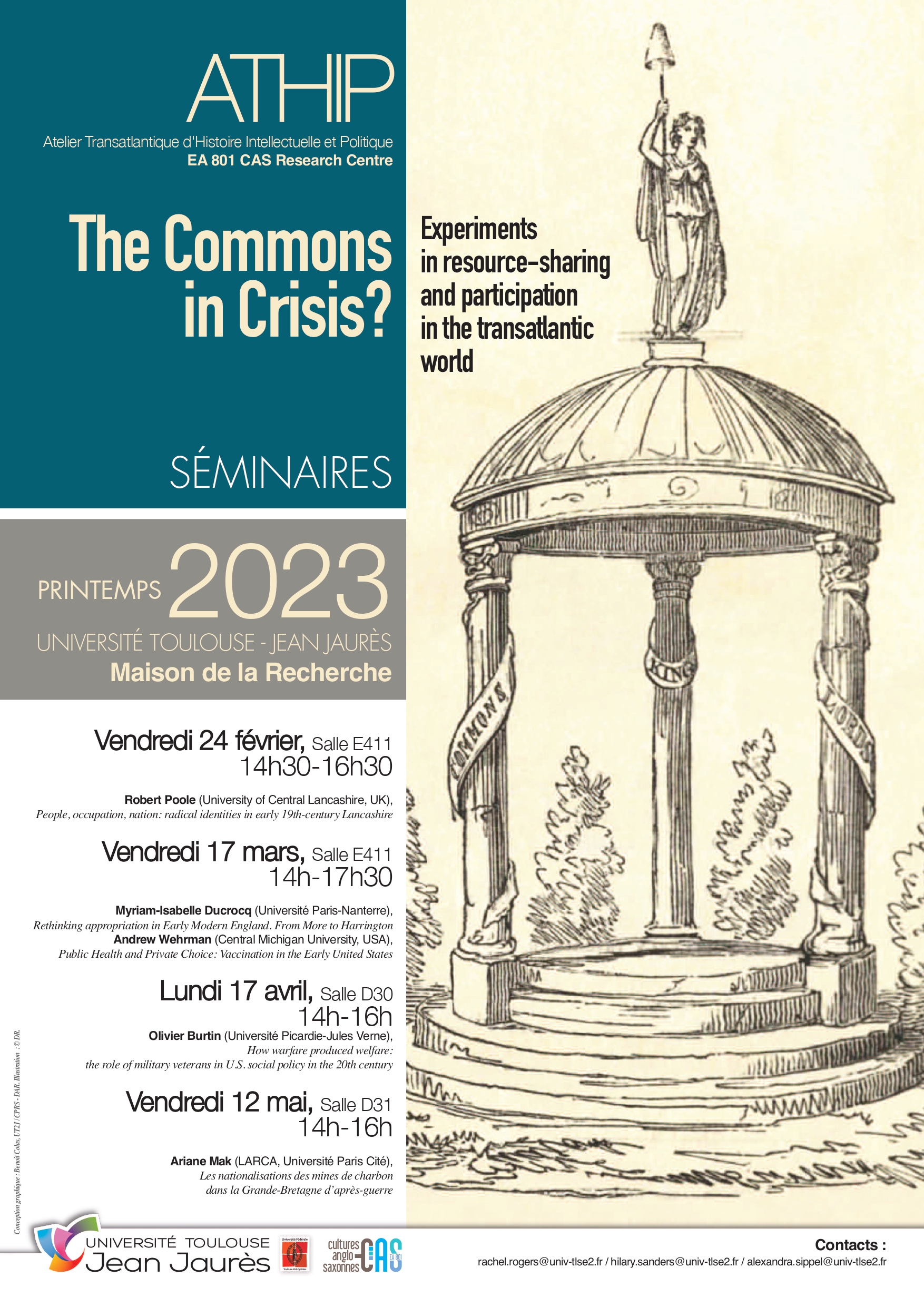 En 2013, une équipe d’enseignants-chercheurs de l’Université Toulouse – Jean Jaurès, regroupant des spécialistes de civilisation américaine et de civilisation britannique, a créé un nouveau groupe de recherche, l’ATHIP : l’Atelier Transatlantique d’Histoire Intellectuelle et Politique. L’ATHIP fait partie de l’axe 3 du laboratoire CAS (Centre for Anglophone Studies), intitulé « Construction(s) de l’individu et du collectif ».Le but scientifique de l’ATHIP est de soutenir les activités des chercheurs (enseignants-chercheurs et doctorants) qui travaillent sur des thématiques liées à l’histoire des idées et l’histoire politique s’inscrivant dans le monde atlantique. A ces fins, ATHIP organise des séminaires mensuels à l’Université de Toulouse – Jean Jaurès, d’une durée de 1h30 (entre 12h30 et 14h, généralement le premier mardi du mois) et auxquels viennent assister des chercheurs et des étudiants, de niveaux Master ou Doctorat, travaillant dans des disciplines variées (civilisation, histoire, sociologie…). Ces séminaires accueillent des chercheurs venus du site toulousain, mais aussi d’autres institutions françaises (comme l’Université de Paris Ouest – Nanterre – La Défense ou l’Université Bordeaux-Montaigne), ainsi que d’universités étrangères (comme Dickinson College aux Etats-Unis). L’ATHIP organise également une Journée d’Etudes à la fin de chaque année universitaire depuis 2014.